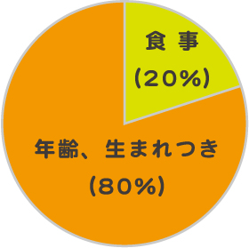 食事や生活由来の原因は20%で残り80%は加齢や遺伝などが原因です。こういったものがベースにあると食事や生活習慣のみで改善することはかなり困難となります。もちろん、肥満や生活習慣も十分な原因となります。(中年発症や肥満などメタボリックシンドロームがあるもの)